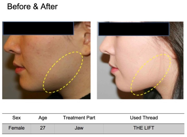 これぞフェイスラインのリフトアップ効果がでています。年齢的にたるんだ皮膚というわけではないのですが、ぽっちゃりしたフェイスラインを引き上げたという症例です。