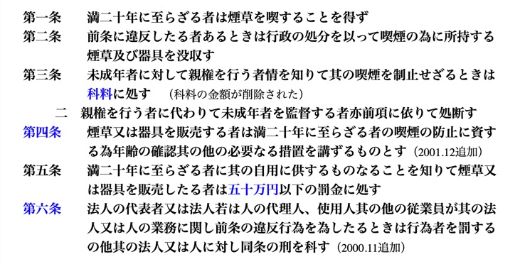 青文字のところが2000年以降に改正された部分とのことです。第三条の「未成年者に対して親権を行う者情を知りて其の喫煙を制止せざるときは科料に処す」の部分に注目。