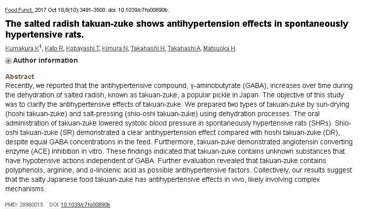 前掲論文ではたくあん漬けに含まれるGABA以外の物質が、さらに血圧を下げる効果があるのではないか、と予測しています。