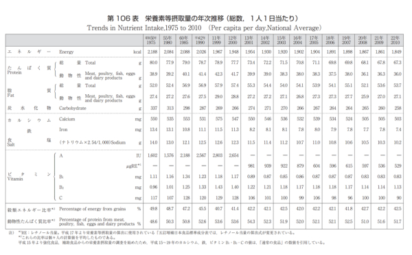 表が見にくいので抜き書きすると 1975年2188 、2000年1948 、2005年1904、 2010年1849、となっていて年々総カロリーは減少しています。長寿傾向とカロリーの摂取の減少は一致しているように一瞬思ってしまいます。