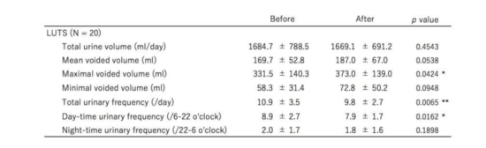 研究方法は下部尿路症状、便秘、hypersensitivity to cold(多分、冷え性?)である24人に対して1日2回青竹踏みを28日間に渡って行ってもらいました。排尿状況に対しては前立腺肥大症の程度を見分ける「国際前立腺症状スコア(IPSS)」と過活動膀胱の程度をみる「過活動膀胱症状スコア(OABSS)」を使用しています。同時に便秘とhypersensitivity to coldに対する評価も行なっています。その結果